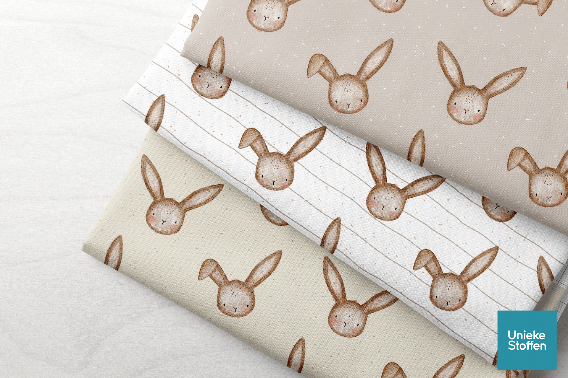 De liefste little bunnies voor de liefste kleding en accesoires, In drie achtergrondkleuren beschikbaar.