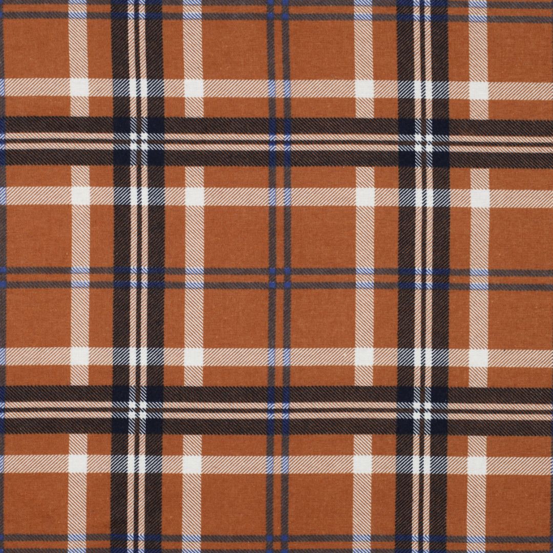 Flanel roest met blauwe ruit. De perfecte stof voor een pyama, overhemd of toffe Indy shacket.
