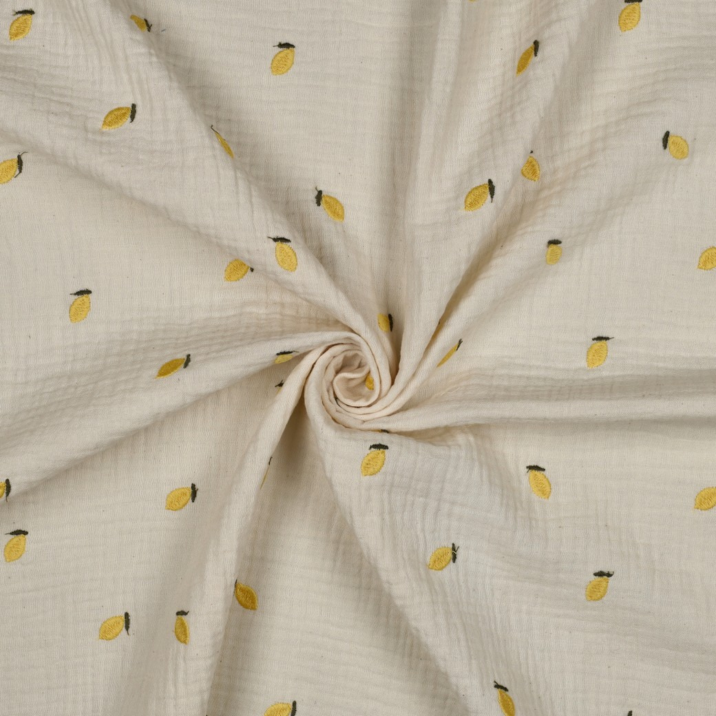 De allerliefste hydrofiel, met schattige geborduurde citroentjes. De stof heeft een offwhite achtergrond.