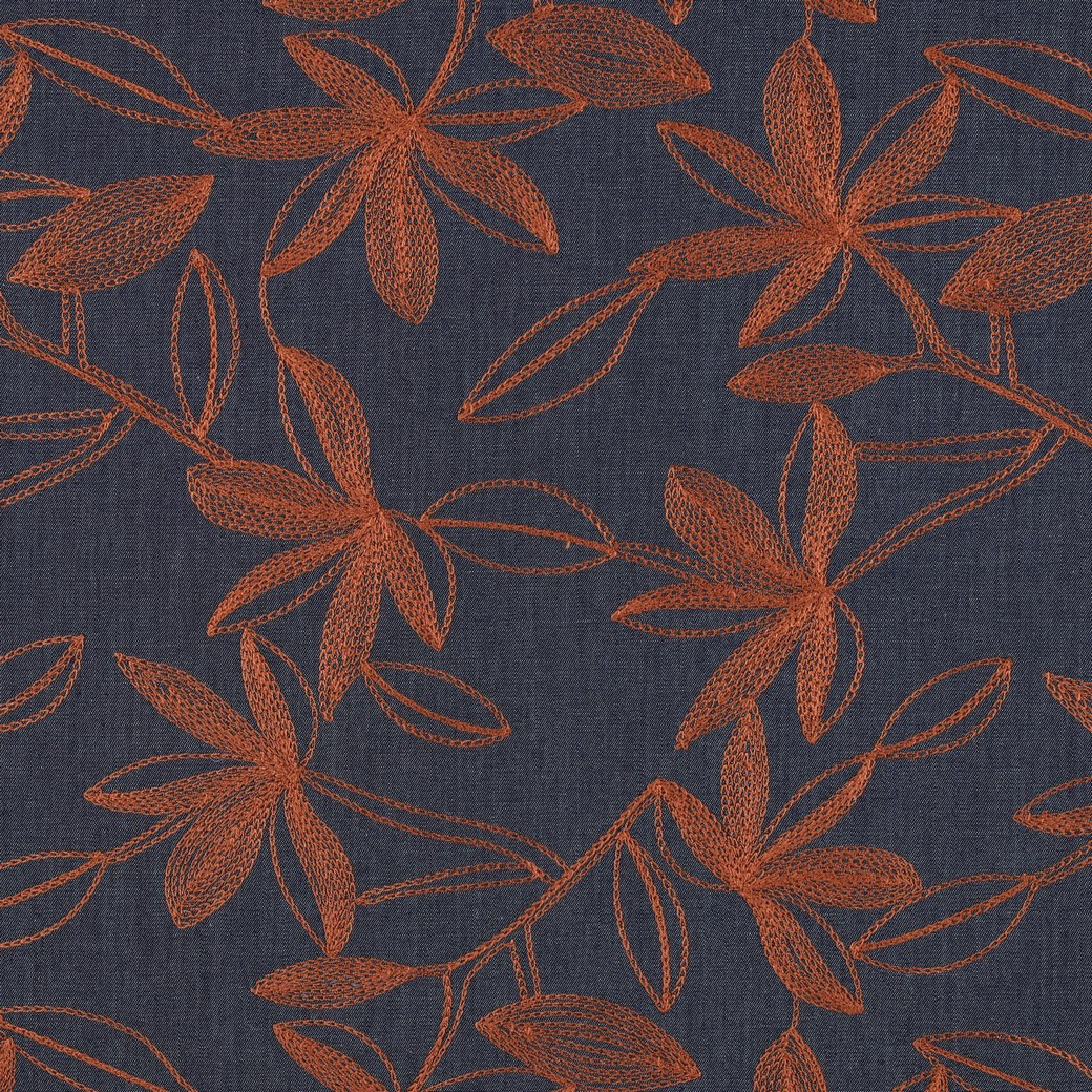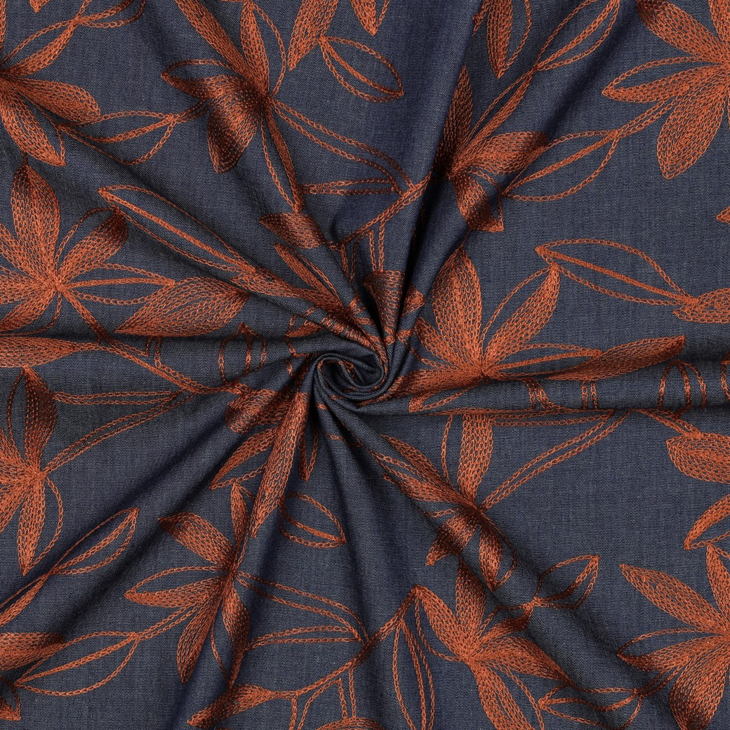 Soms zie je van die stoffen die je niet kunt laten liggen.... dit is er zo 1. Een prachtige soepele denim met roodbruine geborduurde bloemen.