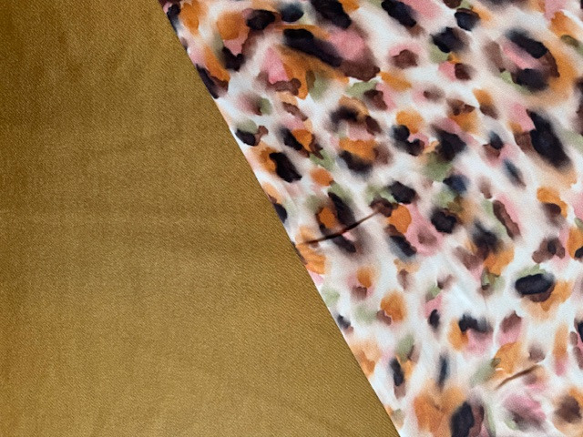 Rayon mix in oker met wat glans. Past mooi bij de pantervlek katoen.