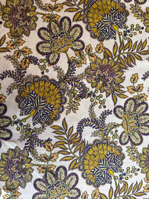 Prachtige katoen met grote blockprint bloemen. Past mooi bij de groene lyocell met rimpelstructuur. Ook de limegroen stoffen passen goed bij deze katoen.
