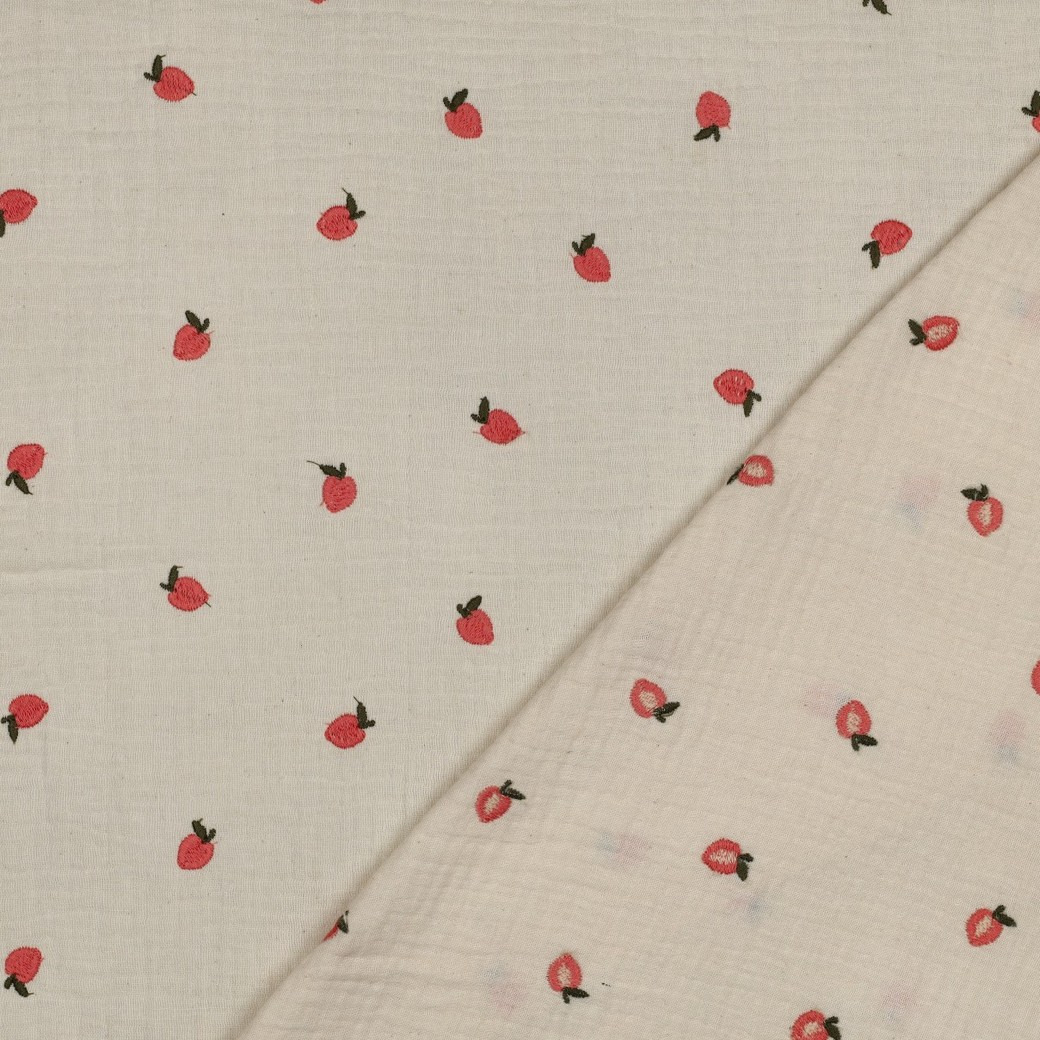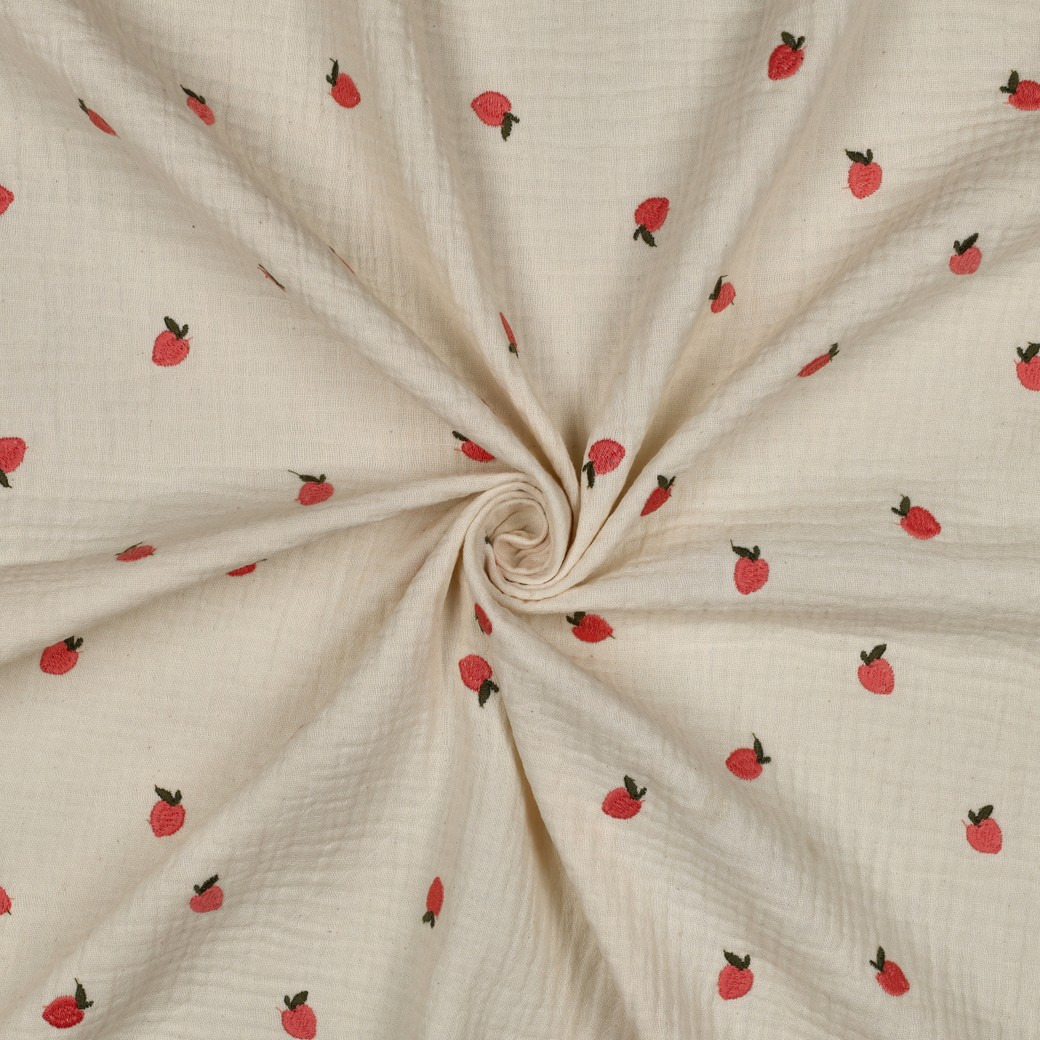 De allerliefste hydrofiel, met schattige geborduurde perzikjes. De stof heeft een offwhite achtergrond.