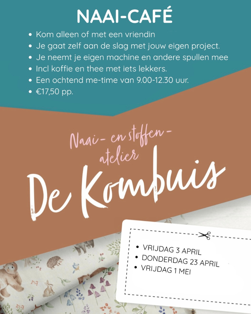 Kom een ochtend gezellig naaien in ons atelier in Dinteloord samen met andere sewista's! Het naaicafé is van 9.30 tot 12.30 uur en voor koffie, thee en wat lekkers wordt uiteraard gezorgd.