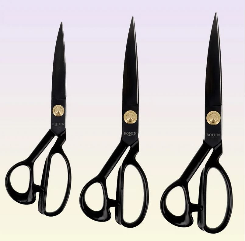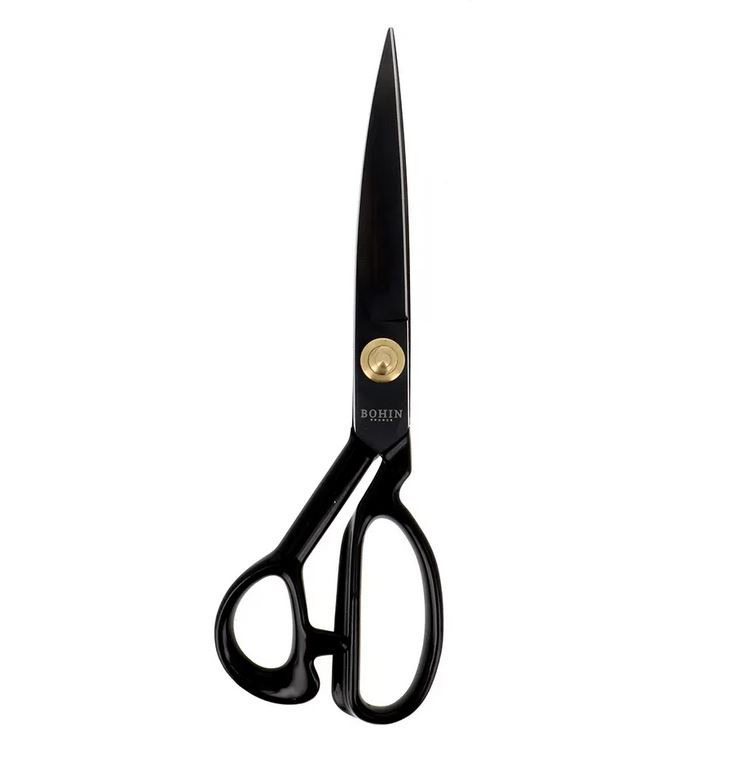 Voor het vele knipwerk heb ik zelf voor deze Bohin kleermakersschaar gekozen: een flink zwaar exemplaar. Deze scharen zijn gemaakt van koolstofstaal. Je knipt de zwaarste stoffen met gemak, maar ook fijne stofjes kan hij prima aan. De handvaten hebben een rubberen coating waardoor de schaar prettig in de hand ligt.