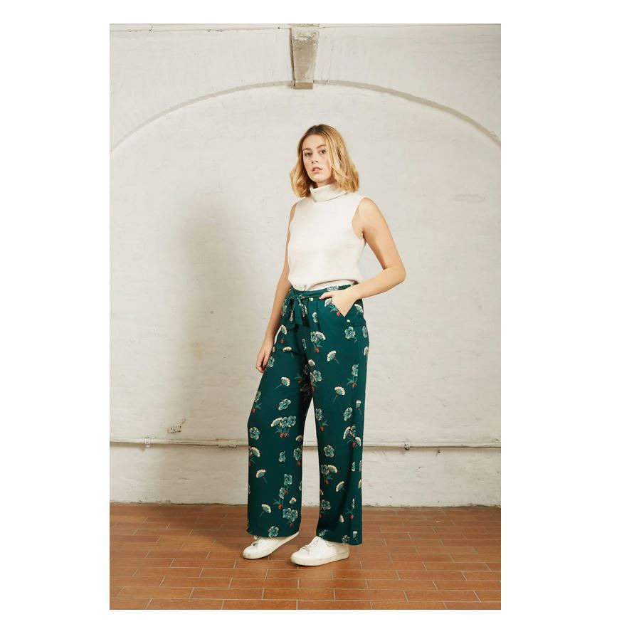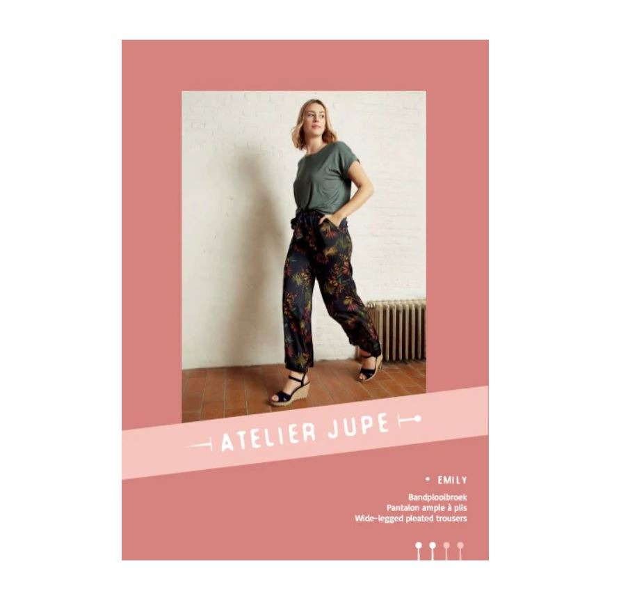 Emily is een brede, losse broek met een kleine plooi in het voorpand, schuine steekzakken en een tailleband met elastiek. De elegante linten om de broek dicht te knopen, maken het helemaal af.